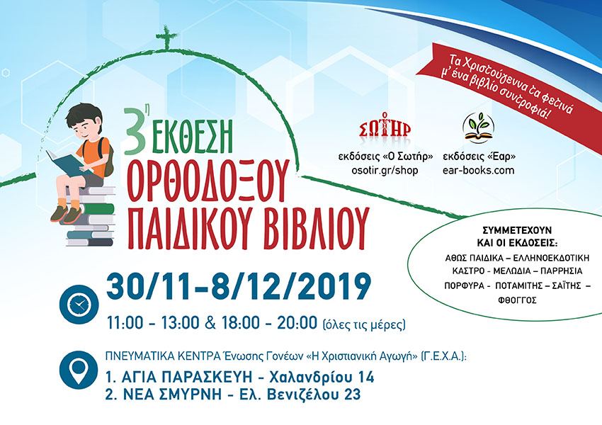 Οἱ ἐκδόσεις “Ὁ Σωτήρ” καί “Ἔαρ” διοργανώνουν γιά 3η χρονιά Ἔκθεση Ὀρθόδοξου Παιδικοῦ Βιβλίου στήν Ἀττική, στίς αἴθουσες τῆς Πανελληνίου Ἑνώσεως Γονέων “Ἡ Χριστιανική Ἀγωγή” στήν Ἁγία Παρασκευή (Χαλανδρίου 14) καί στή Νέα Σμύρνη (Λεωφ. Ελ. Βενιζέλου 23). Λεπτομέρειες καί πρόγραμμα τῶν ἐκδηλώσεων πού πλαισιώνουν τήν Ἔκθεση στήν ἱστοσελίδα τῆς ἐκθέσεως eopb.gr.