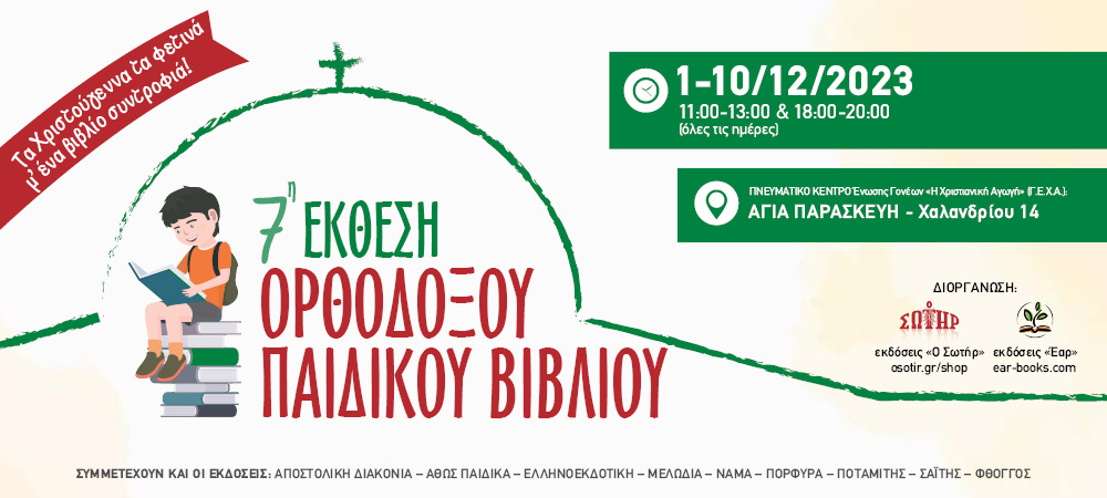 Ἐνόψει τῶν Χριστουγέννων οἱ ἐκδόσεις «Ἔαρ» καί «Ὁ Σωτήρ» διοργανώνουν τήν 7η Ἔκθεση Ὀρθόδοξου Παιδικοῦ Βιβλίου!