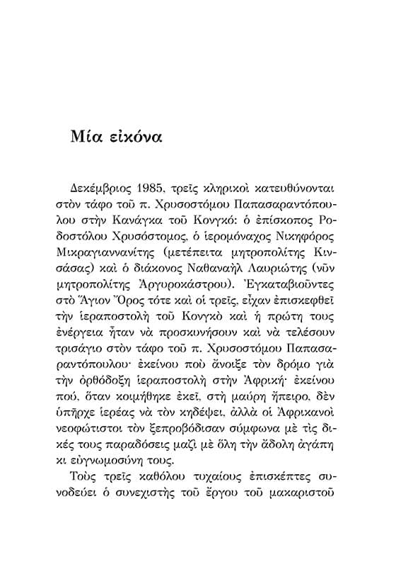 Η ζωή και το έργο του νεοκαταταγέντος αγίου Χρυσοστόμου Παπασαραντόπουλου, του ιεραποστόλου της Αφρικής. Προλογίζει ο μητροπολίτης Κινσάσας κ.κ. Θεοδόσιος.