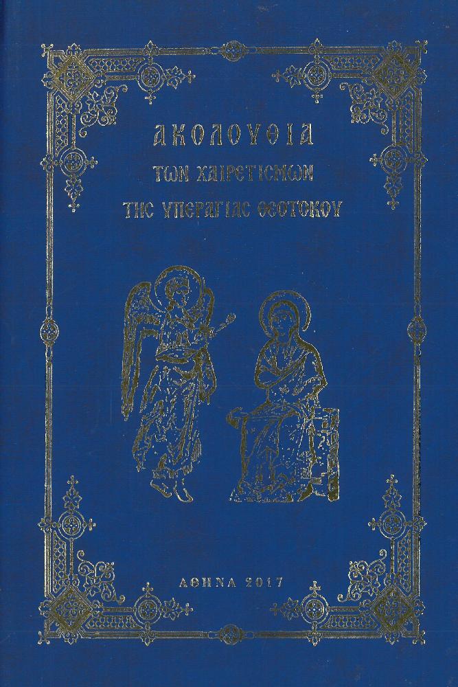 Η ακολουθία των Χαιρετισμών της Υπεραγίας Θεοτόκου σε πολυτελή έγχρωμη και διακοσμημένη με βυζαντινά διακοσμητικά έκδοση με δερματόδετο εξώφυλλο και χρυσοτυπία.