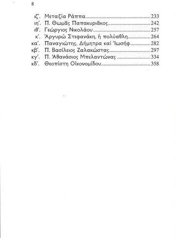 Περιέχει είκοσι τέσσερις βιογραφίες· οι οκτώ βιογραφούμενοι ήταν ιερείς έγγαμοι, εννέα ήταν γυναίκες απλές και αγράμματες και οι υπόλοιποι επτά ήταν άνδρες.