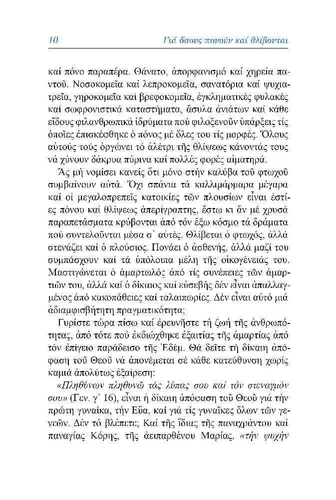 Στο θείο αυτό έργο της παρηγορίας και ενισχύσεως των θλιβομένων αποβλέπει, αδελφέ μου, το μικρό τεύχος που κρατάς στα χέρια σου. Δεν στηρίζεται σε κούφια και μάταια λόγια των ανθρώπων. Αντλεί από το αιώνιο βιβλίο της σοφίας του Θεού, την Αγία Γραφή, και παραθέτει σκέψεις παρηγορητικές και ενισχυτικές για τους πονούντες και θλιβομένους.