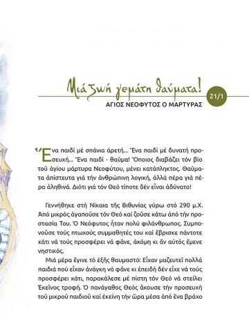 Περιέχονται γεγονότα από τους βίους του αγίου Νεοφύτου του νεομάρτυρα, της αγίας Αγάθης, του αγίου Ανθίμου της Χίου. της αγίας μεγαλομάρτυρος Ειρήνης, της οσίας Μακρίνας, του αγίου Θεοχάρη του νεομάρτυρα, της αγίας Ακυλίνας, του αγίου Γεωργίου του Καρσλίδη, της αγίας Βαρβάρας και του αγίου Ιωάννη της Κρονστάνδης.