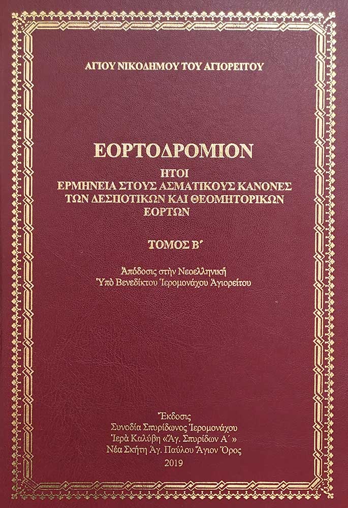 Ερμηνεία του αγίου Νικοδήμου του Αγιορείτου στους ασματικούς κανόνες των Δεσποτικών και Θεομητορικών εορτών. Μεταφρασμένο στη δημοτική.
