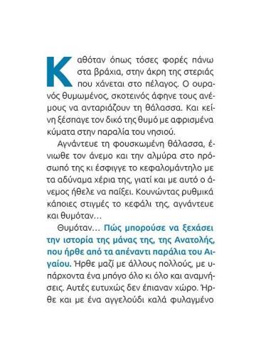 Σ’ έναν βράχο του Αιγαίου είχε τον θρόνο της· εκεί ένιωθε βασίλισσα η γιαγιά Θαλασσινή. Αγνάντευε, θυμόταν, προσευχόταν και γέμιζε η ψυχή της… Παρότι ήταν ολομόναχη στη ζωή, η αγκαλιά της δεν έμενε ποτέ άδεια. Όπως και το σπίτι της, που γέμιζε γιατί ήξερε να δίνει αγάπη από την ψυχή της. Κυρίως στα παιδιά!