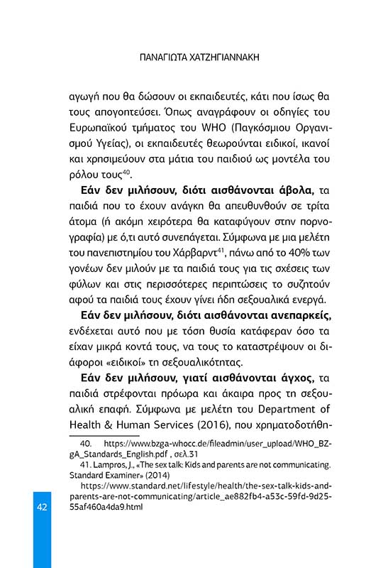 Πρόκειται για μια εξαιρετική παρέμβαση από μια πιστή ιατρό. Η λεγόμενη “συμπεριληπτική σεξουαλική αγωγή” έχει ήδη εισβάλει στην εκπαίδευση και προσπαθεί με ύπουλο και συστηματικό τρόπο ν’ ανατρέψει τις παραδοσιακές αντιλήψεις για την οικογένεια. Η συγγραφέας δεν επισημαίνει απλώς τους κινδύνους, αλλά εισηγείται και τρόπους για μια υγιά σεξουαλική αγωγή στα πλαίσια της οικογένειας. Το βιβλίο χαρακτηρίζεται από επιστημονική εγκυρότητα και διαπνέεται από την “καλή ανησυχία” για τη νέα γενιά. Κάθε γονιός, που νοιάζεται για τη διαμόρφωση μιας υγιούς προσωπικότητας στο παιδί του, οφείλει να το διαβάσει με πολλή προσοχή.