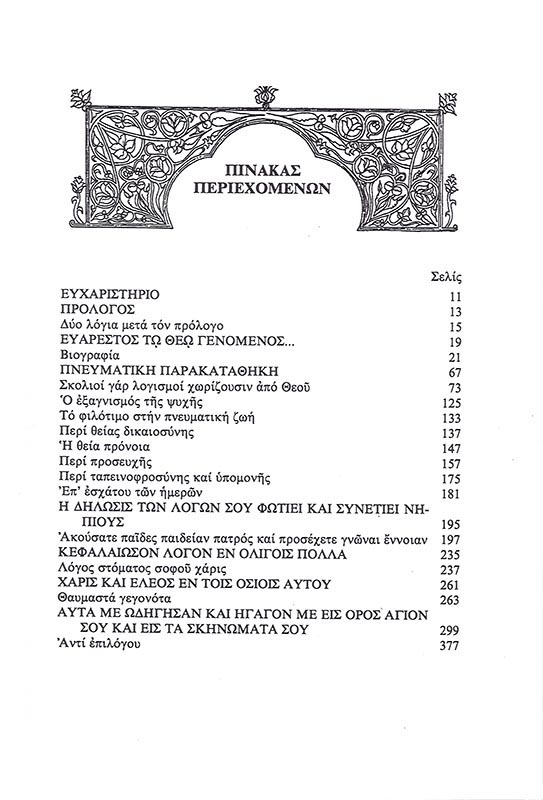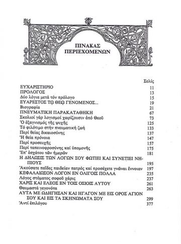«Με όσα εκθέσω σ’ αυτό το βιβλίο θα προσπαθήσω, από την αρχή έως το τέλος, να έχω ένα σκοπό και τον εξηγώ: Γνωρίζοντας πολύ καλά ότι από μένα είναι φύσει αδύνατον να προέλθει κάτι καλό, θα προσπαθήσω να μην εισάγω τίποτε δικό μου στα άγια και ταπεινά λόγια του Γέροντα και θα παραθέσω, κατά το δυνατόν, αυτούσια τα δικά του λόγια. Αυτός εξάλλου είναι κι ο λόγος πού τα διάφορα θέματα – κεφάλαια του βιβλίου αυτού δεν παρουσιάζονται σε μορφή συνταγμένων ενοτήτων. Παρουσιάζονται οι συζητήσεις αυτοτελώς – κάποτε με ορισμένες επαναλήψεις, οι οποίες όμως “φωτίζουν” από διαφορετικές πλευρές το εξεταζόμενο θέμα – και ακολουθούν πολλά παραδείγματα, από την καθημερινή ζωή, με τα οποία ο Γέροντας, με μοναδικό τρόπο, έκανε σαφές ότι έλεγε.» (Από τον πρόλογο της έκδοσης)