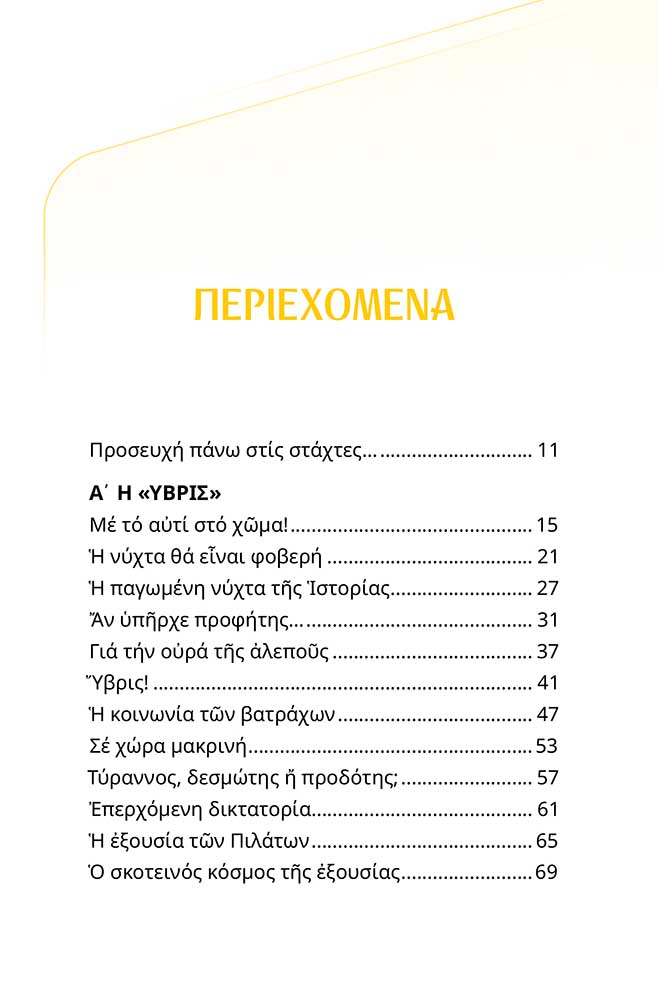 Ρωμαλέα κείμενα, με προφητικό χαρακτήρα. Με πιστότητα στο νόμο του Θεού, ο συγγραφέας απευθύνεται με ειλικρίνεια στο σημερινό άνθρωπο και τον καλεί σε αλλαγή πορείας. Εγερτήριο σάλπισμα για μια κοινωνία που κατρακυλά στα σκοτάδια. Πρέπει να διαβαστεί, γιατί είναι γραμμένο με πόνο και πολλή προσευχή.