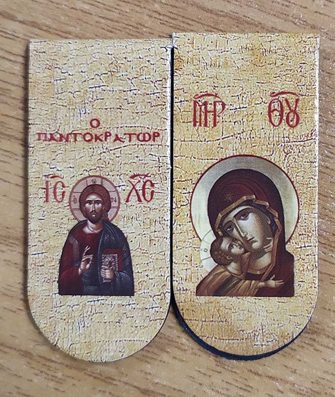 Σελιδοδείκτης διπλής όψης με μαγνήτη. Στη μια όψη έχει την εικόνα του Παντοκράτορα και στην άλλη την εικόνα της Παναγίας.