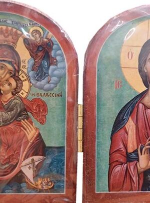 Ξύλινη εικόνα δίπτυχη. Στη μια πλευρά εικονίζεται ο Ιησούς Χριστός και στην άλλη η Παναγία η Οδηγήτρια.