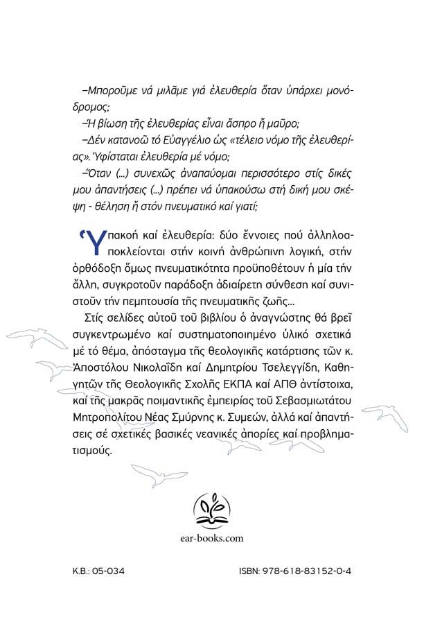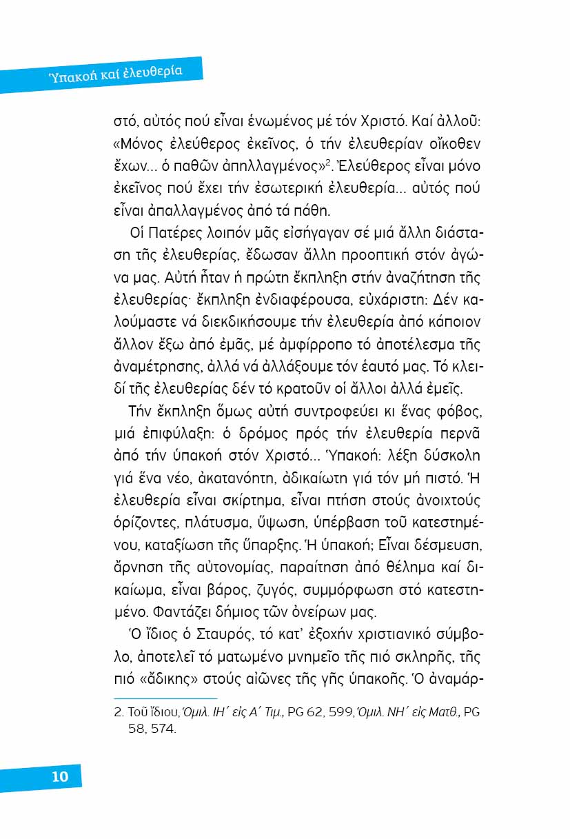 Υπακοή και ελευθερία: δύο έννοιες που αλληλοαποκλείονται στην κοινή ανθρώπινη λογική, στην ορθόδοξη όμως πνευματικότητα προϋποθέτουν η μία την άλλη, συγκροτούν παράδοξη αδιαίρετη σύνθεση και συνιστούν την πεμπτουσία της πνευματικής ζωής…